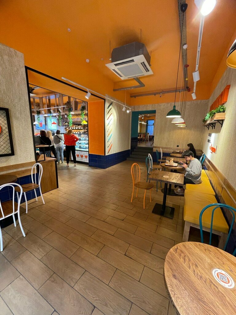 Вкусная выпечка, приятные цены, латте хорошо идёт. Есть скидка по пироги вечером. На завтрак не ходила. Пришла в 22 с чем то, ушла незадолго до закрытия, переждала дождь, пообщалась с подругой. Сидела в дальнем зале. Там есть туалет, код для открытия двери в чеке. Заказ выбрала на месте, ела его внутри. Стойка с пластиковыми приборами для еды, сахаром, солью, перцем, зубочистками и салфетками отдельно, тут же контейнер для мусора. Делаешь заказ, когда он собран, то его выносят на подносе на столик возле витрин с едой. В "Люди Любят" не только выпечка,но и готовые блюда, которые можно купить и съесть или забрать с собой. Мне нравится "Люди Любят", жаль что в Курске этого заведения нет! Третий год летом приезжаю на фестивали и захожу в "Люди Любят".