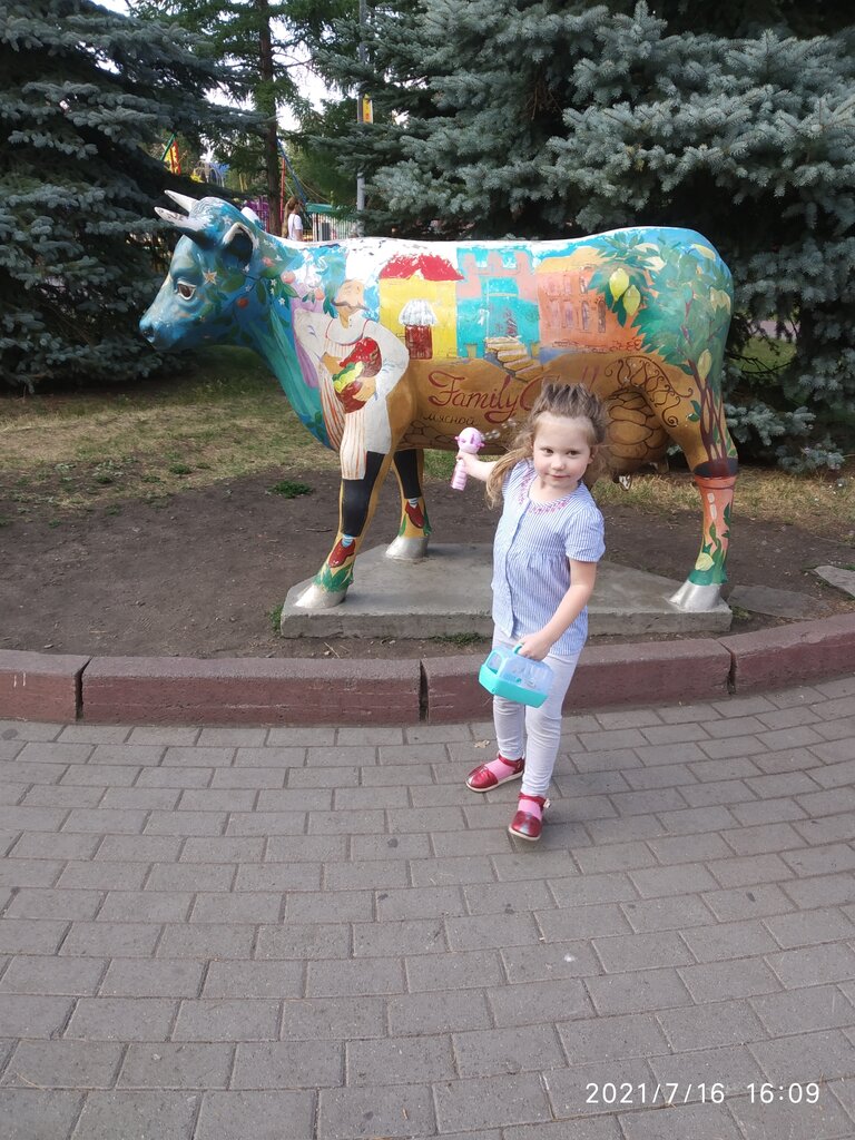 В парке Гагарина, рядом с аттракционами. Мне кажется, корова симментальской породы, но рисунок шкуры периодически меняется. Дети любят фотографироваться верхом.