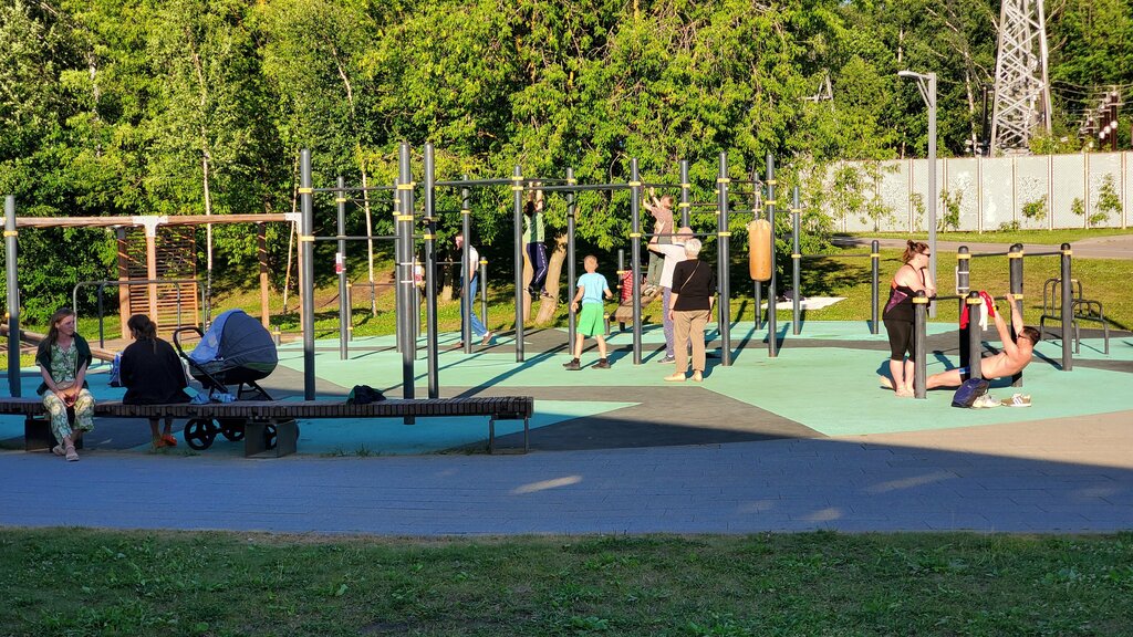 Все виды турников есть. Резиновый пол. Места очень много. Воздух от водоёма влажный. = Всё отлично.