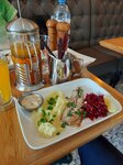 В музейные кассы была очередь и мы решили её переждать за столиком этого чудного кафе. Начали изучать вкусные завтраки, но так как время уже к обеду, перешли к горячему. Отличная жирная селёдка, классическое сочетание с пюре, свёклой и пряным соусом, м-м-м. На десерт пирожное из фисташкового бисквита со сливками. Столики и в помещении, и на площади перед собором. Красивая внутренняя отделка, преобладает стиль модерн, но некоторые предметы выбиваются, просто эффектные. Весло под потолком.Или пивная бюргерная кружка. Сложно было определить, цеховая, полковая или просто сувенир, но эти пивные кружки имеют свою историю происхождения и традиции. Такой мостик из средневековья. Эта была по виду из дерева или керамики, но они были и оловянные, и даже из слоновой кости. Средний чек 1500₽. Отличное место посидеть с чашечкой чая и поесть, рекомендую.