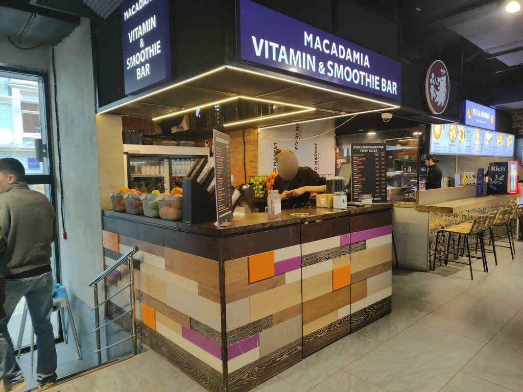 15 мая в 14:30 покупала смузи. Стойка рядом со входом. Уборщица подметает ковер веником. Пыль на свету в высоту метр. Я говорю - здесь готовят сейчас смузи. Ваша пыль летит на продукты, трубочки, стаканчики везде. Прекратите. Продавцу было все-равно. Я надеялась, что он объяснит уборщице, т.к. она не понимала по-русски. Антисанитария. Зловоние. Вытяжка не работает. Пока ждала смузи, одежда, волосы пропитались запахом горелого масла, фритюра, жарева. Нарушение элементарных норм санэпидемстанции.