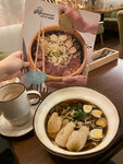 Сегодня посетили это заведение. Очень понравились атмосфера и приветливый персонал, особенно официанты. Кондитерские изделия — просто восторг, на высшем уровне! Однако к горячим блюдам есть вопросы. Заказывали рамен с курицей, и, к сожалению, качество еды подвело: после ужина остались неприятные ощущения в животе (пришлось даже прибегнуть к сорбентам). Да и подача могла бы быть красивее, как на картинке в меню(к цвету мяса претензий нет). Очень хочется, чтобы кухня соответствовала уровню сервиса и десертов