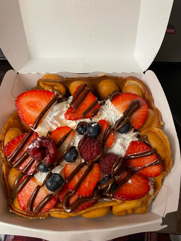 Хорошие вкусные вафли, большой выбор, чего только нет: с ягодами, с шоколадом, с мороженым. Периодически берём с детьми. Делает очень милая женщина. Стоят конечно не дёшево, но вкусно)