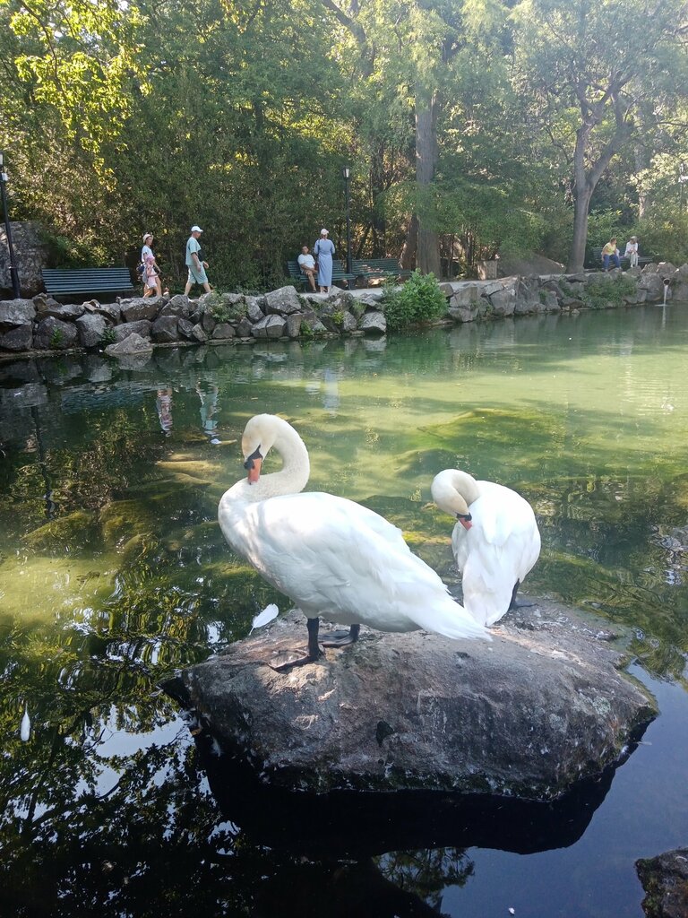 За домиком лебедей лавочки с прекрасным видом на озеро, фонтан и Ай-Петри (до обеда в тени). Лебедь Гриша реагирует и приплывает, если опуститься к озеру - берегите руки! В июне случилось пополнение - родились два лебеденка😍