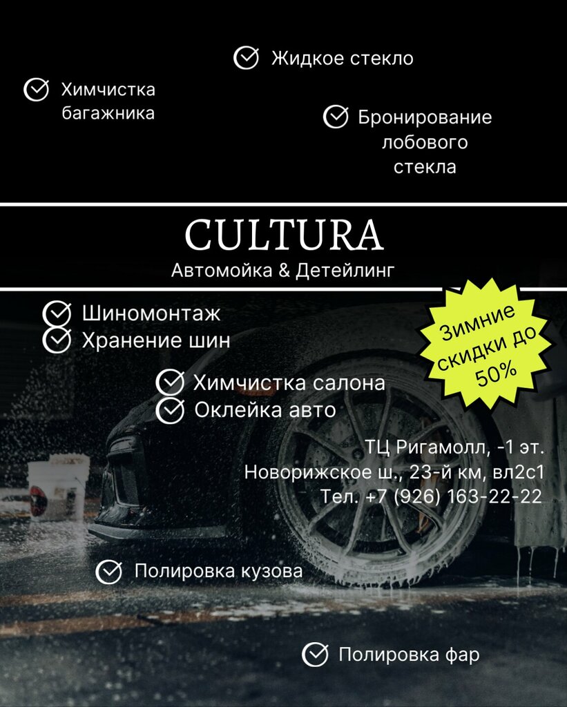 От 1700₽ - 2500₽. Финальная стоимость зависит от класса автомобиля. 3-х фазная мойка Koch Chemie кузов, коврики, пороги, чернение. Кузов чистый, ухоженный и готов к дальнейшей защите! Приезжайте в CULTURA! ТЦ Ригамолл, -1эт. Новорижское ш, 23-й км.