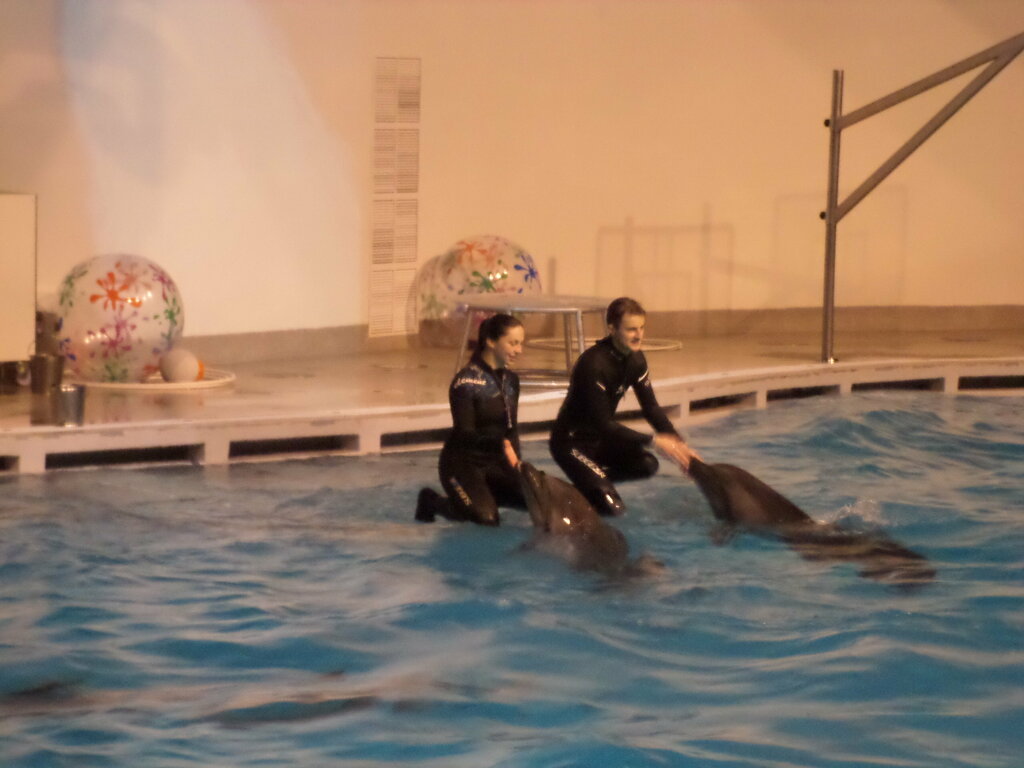A very good dolphinarium! Seats in the front rows are more expensive, but you can get wetter after the dolphin hits the water with its tail! Dolphins play basketball, jump through hoops, and carry trainers on their noses.