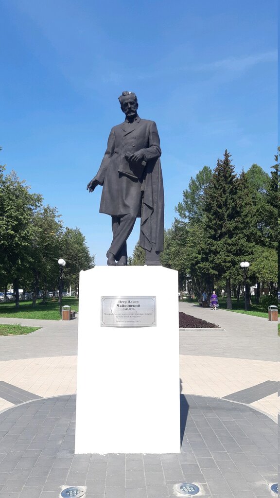 Фото памятника следует обновить. Нет уже вокруг Петра Ильича цветов. За сквером сейчас уход виден — всегда чисто, красиво, трава подстрижена вовремя. Хорошо. Благодарность фирме по благоустройству этого сквера.