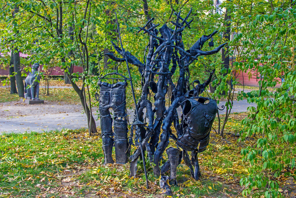 Сверх креативный и много мысленный памятник С первого раза не догадался))) Но школьное образование позволило узнать творчество великого сервантеса Какой именно смысл вкладывал автор в скульптуру не ясно Зато получилось во истину оригинально