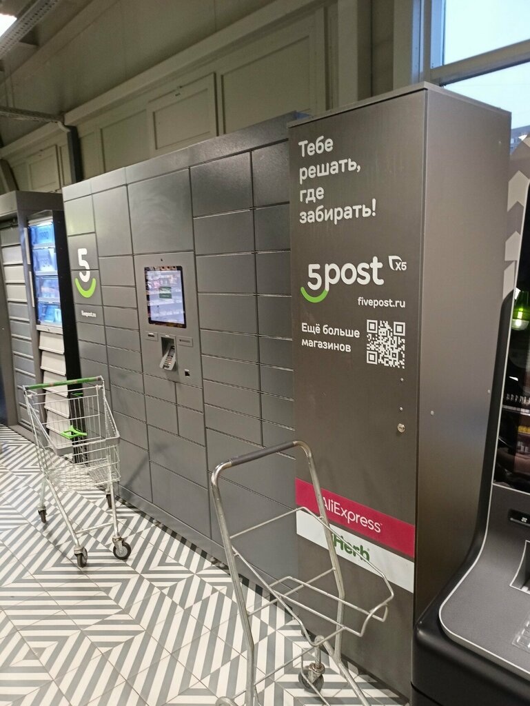 Терминал находится у касс, в целом удобно, так как пятерочка находится у дома и можно забрать посылку и купить продуктов.