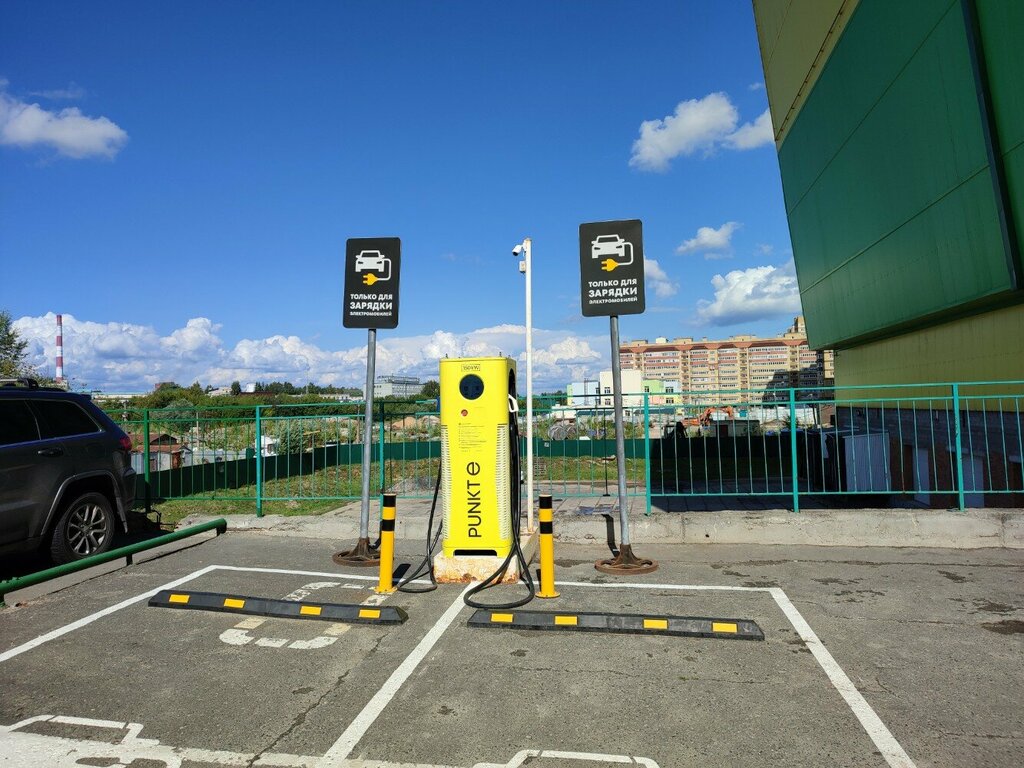 Очень удобная электрозарядная станция около торгового центра. Заезжали по дороге в Йошкар-олу. В торговом центре и покушать можно и в туалет сходить.