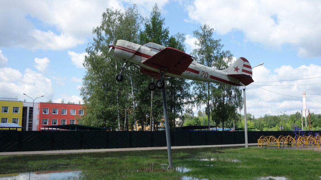 Памятник самолету Як-52 установлен на столбе в парке Победы. Состояние самолета хорошее, странно выбран вариант крепления, но самолет хорошо просматривается со всех сторон. Находясь поблизости, стоит осмотреть.