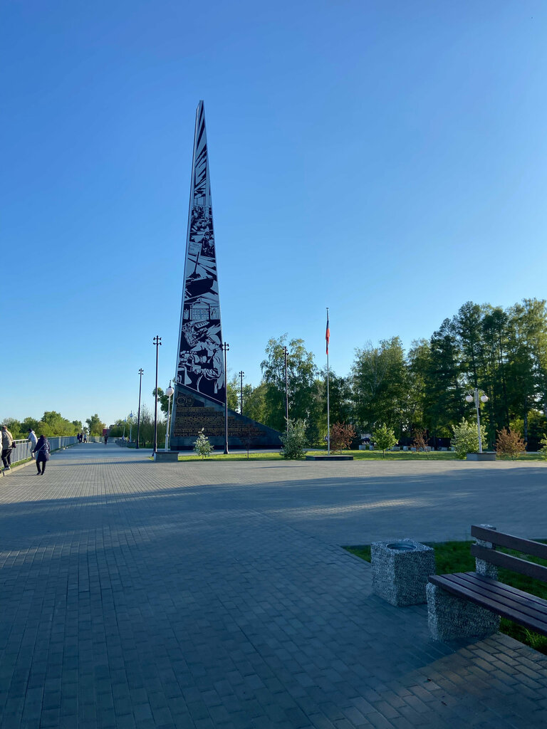 Стелла впечатляет. Особенно надписи на ней. Читаешь и понимаю, что город сделал для страны во время ВОВ. Вокруг небольшой сквер с красивыми цветущими деревьями. И замечательный вид на Обь.