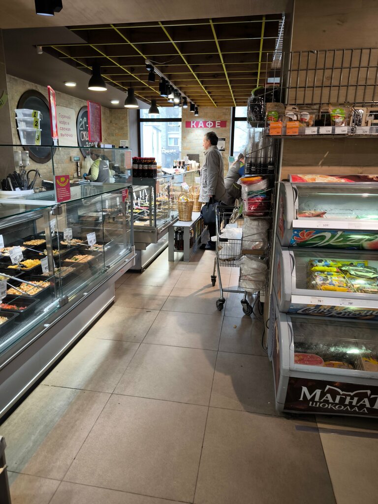 Супермаркет в шаговой доступности. Как и все магазины этой сети держит марку. Продукты свежие. Постоянно есть акции на товары. Можно купить выгодно. Очень хороший отдел готовой продукции. Часто беру салаты, вторые блюда, рыбку слабосоленую. Есть микроволновая печь, можно взять кофе-чай. Есть зона, где можно сесть и перекусить. Всегда нахожу здесь то, что мне нужно. Чисто, персонал вежливый.