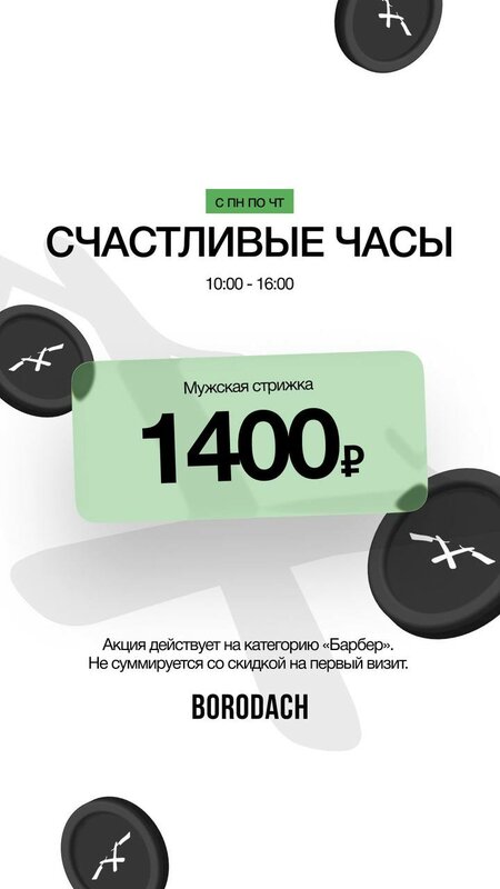 🕐 Счастливые часы в BORODACH Мужская стрижка — 1 400 ₽ Каждый день с понедельника по четверг с 10:00 до 16:00 — самое выгодное время для ...