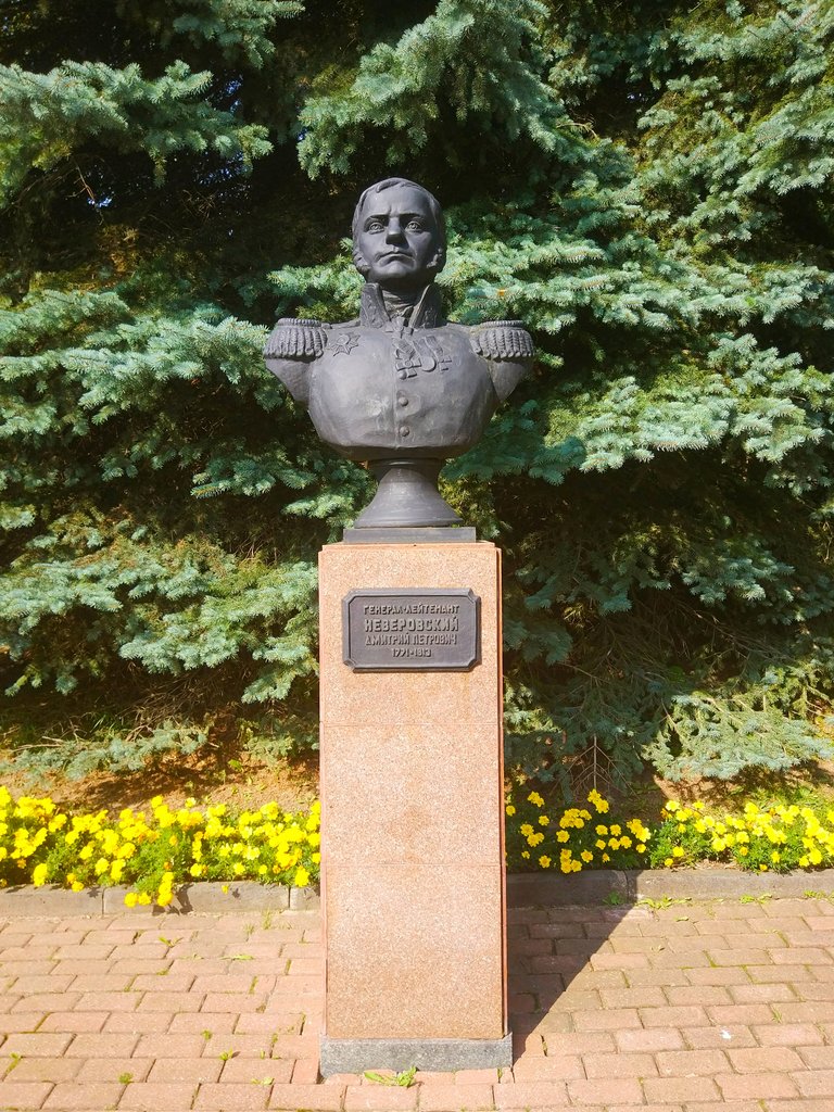 В 1987 году, в честь 175-летия победы в Отечественной войне 1812 года, в Смоленске установили памятный чугунный бюст генерал-лейтенанта Дмитрия Петровича Неверовского. В той войне он командовал 27-й пехотной дивизией, отправленной к городу Красный Смоленской губернии для защиты Смоленска. 2 августа 1812 года дивизия Неверовского героически сражалась с превосходящими силами французской конницы маршала Мюрата у Красного. Это противостояние сорвало план Наполеона отрезать русские войска от Смоленска и обойти их с тыла. Неверовский построил свою дивизию в каре и в таком строю отступал к городу. В течение пяти часов она отбивала атаки французской кавалерии, преодолев 12 верст. К вечеру натиск Мюрата ослаб, и дивизия добралась до Смоленска, где участвовала в его обороне. Французские солдаты, пораженные мужеством русских, назвали это сражение «отступлением львов».