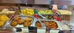 Еда так себе, разагревают в микроволновке, большие куски были холодные! Солонки пыстые, салфетки приходится просить. Персонал без спецодежды, как из дома вышли так и ходят. Диваны ободранные, стены в центральном зале в грибке! Фото приложил, страшно представить что творится в подсобных помещениях! По ценникам не определить что и сколько стоит! Короче, одно слово - таджики!