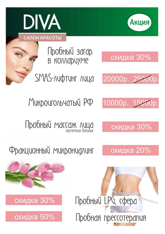 Добрый день! С салоном красоты DIVA знакома достаточно давно, ходила на маникюр, парикмахерские услуги. Перед Новым годом увидела сторис, что есть услуги LPG массажа и эндосферум, не раздумывая сразу записалась и не зря))) Процедуру проводит очень приятная, специалист своего дела! девушка Ксения)) Сразу видно что ей очень нравится и хочется помочь нам девушкам обрести красивую фигуру, подскажет в плане питания, хочется ходить к ней снова и снова!)) А еще с 02 февраля заработал коллариум, солярий плюс коллаген для кожи, супер!! Благодарность Алене, хозяйке салона, за уютную атмосферу и хороший коллектив. Процветания Вам)))