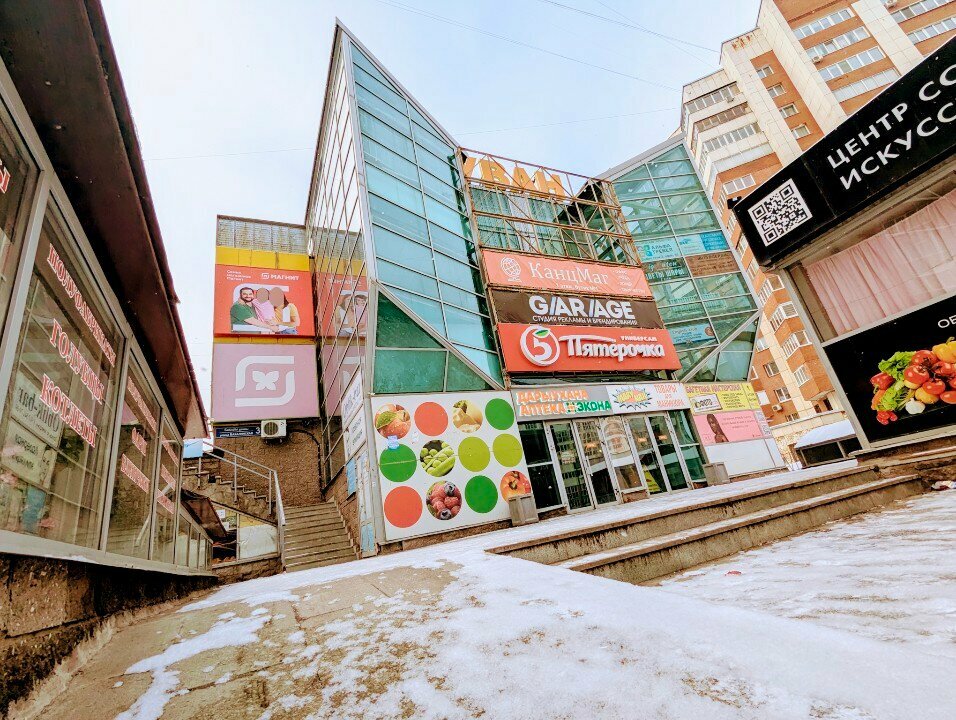 Удобное расположение, рядом с домом. Есть 2 супермаркета (магнит и пятерочка), магнит косметик. Багетная мастерская (пользовались), хороший сервис. Есть столовая, еда вкусная, рядом можно купить лепёшки из тандыра, дешевле, чем в других местах и вкусные. Есть много других мелких магазинчиков. Из минусов-потрепанный вид здания. Уже просится ремонт.
