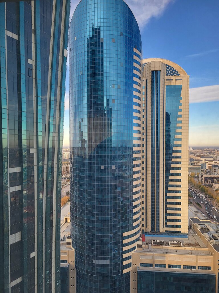 An office building in the very center of Astana. 30+ floors, fitness center, minimarket, good cafe, ATMs. There is paid hourly parking in front of the building, which is not urban, and it is always empty to the left of the building. There are paid hourly city parking nearby, half the price, but almost always occupied. Two multi-level covered parking lots are attached to the building, of which the entrance to the lobby of the building is parking for employees with monthly advance payment. The building has more than 10 elevators. A nice, though not new, office building.
