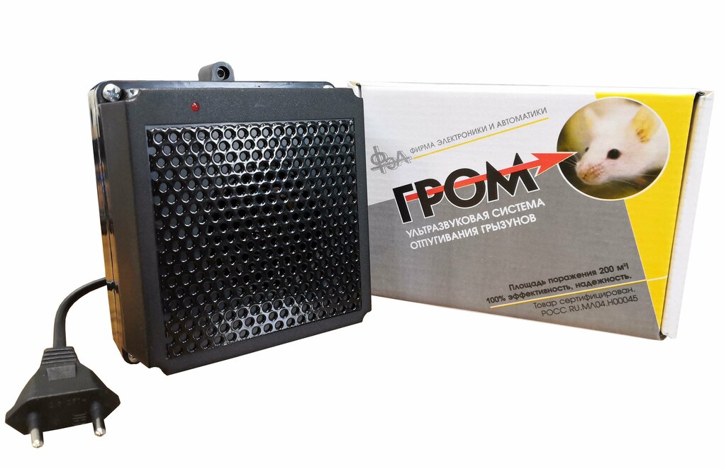 Отпугиватель грызунов (УЗГ "Гром") предназначен для защиты помещений от обитания грызунов (крыс, мышей и др.). Прибор устанавливается в складах, овоще- и зернохранилищах, подвальных, бытовых и производственных помещениях, домах отдыха, турбазах, птиц
