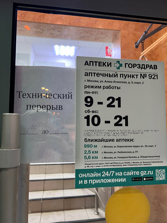 Вопрос не к самой аптеке, а к персоналу. Сколько можно устраивать тех перерыв, минимум 2 раза на 25 минут. Я не против, понимаю, что нужно пообедать и т.д., но не понимаю зачем это делать, когда люди идут с работы и им удобно зайти по пути домой, зная график работы, люди расчитывают, а тут перерыв и приходиться возвращаться в другую аптеку или в обеденный перерыв, когда можно сходить в аптеку. Впервые встречаюсь с таким. В других аптеках этой сети не встречал такого, да и в принципе в других аптеках.