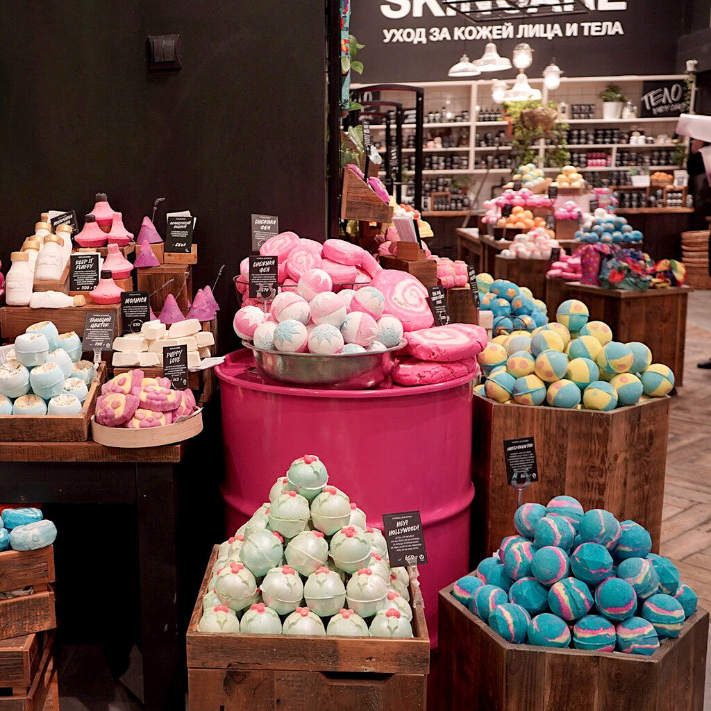 Часто бываю в этом магазине. В самом магазине яркий и заманчивый аромат, т.к. большинство продуктов голые(lush борится с пластиком). Большой просторный зал, привлекательная выкладка. Не многие магазины могут похвастаться мылом, бомбами, или масками ручной работы. Но не lush. У них всё ручной работы. Приветливый персонал, который всё знает и всегда готов вам рассказать больше чем заеете вы. Спасибо lush за такие качественные продукты❤