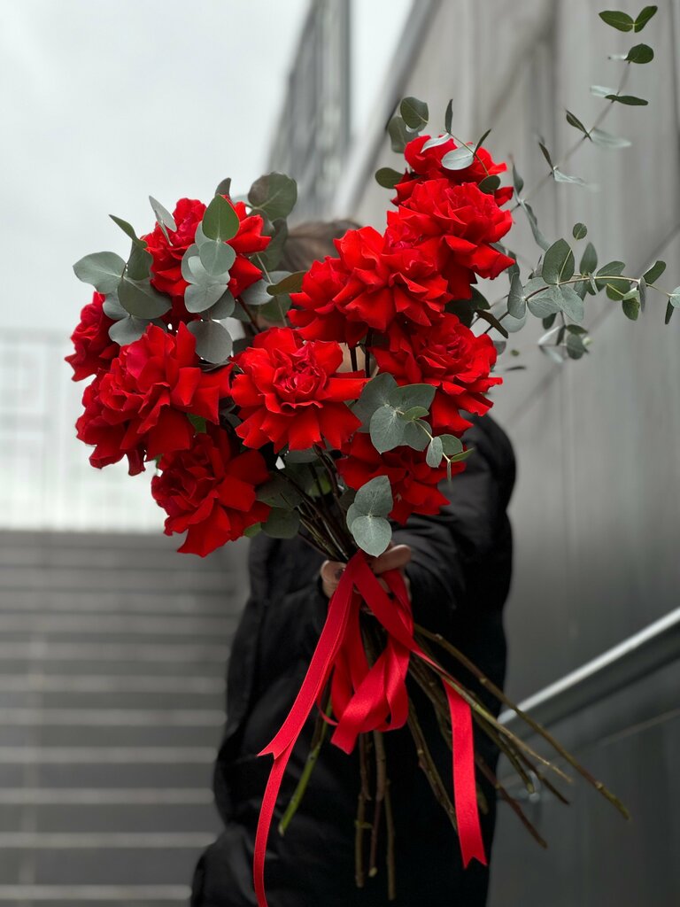 Яркая композиция алых кустовых роз с эвкалиптом