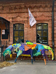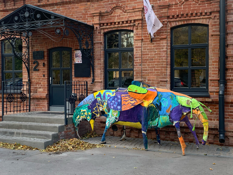 Прикольная разноцветная фигура муравьеда стоит во дворе жилого дома.