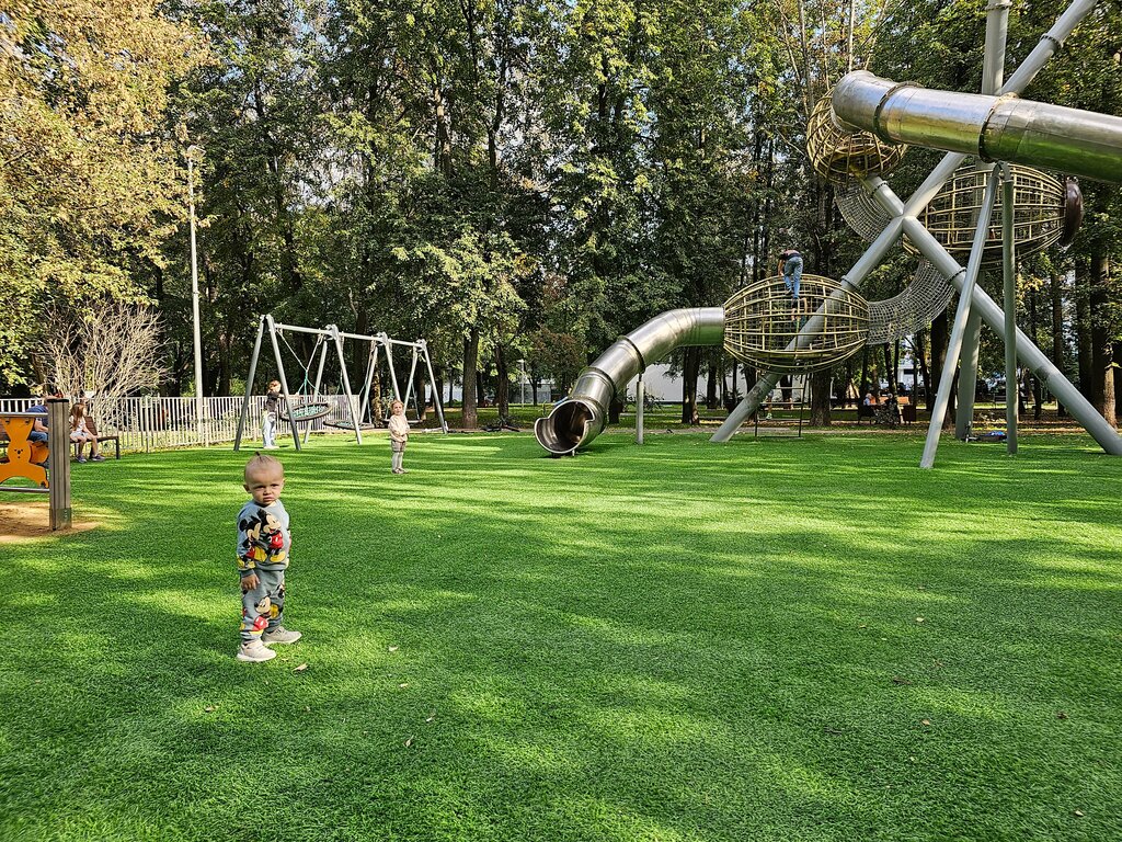 Классная площадка! Для детишек постарше будет интересно. Очень высокая горка. Есть скамейки, урны, что-то вроде качелей. Песочницы не видно.