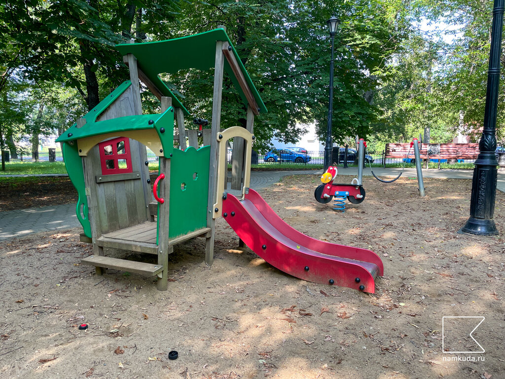 Хорошая площадка разделённая на зоны Больше подходит для детей постарше Есть одна зона для малышей На площадке очень много тополей, поэтому во время тополиного пуха гулять сложно Чисто Рядом трамвайная и автобусная остановки Хорошее освещение