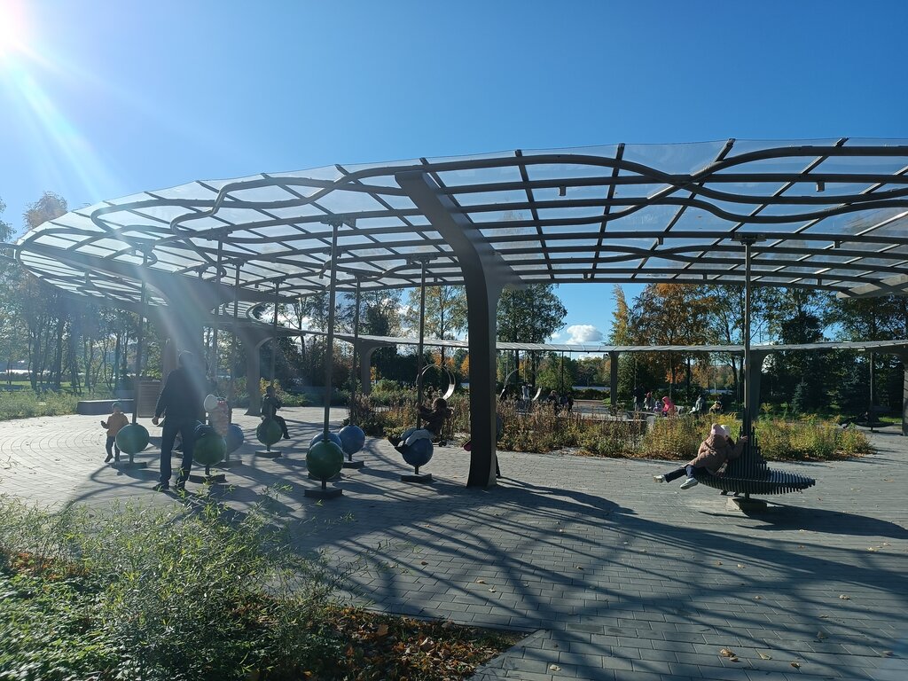 Часто приезжаю сюда с внуком. Есть, где припарковаться и чем заняться - целый космический городок с различными качелями/каруселями, горками и целой дорожкой из батутов. Зависаем здесь на несколько часов. Что немаловажно - есть туалет и он бесплатный, а вот перекус беру с собой, даже воды негде купить. Удобное мягкое покрытие на всей площадке, которое вовремя ремонтируют.