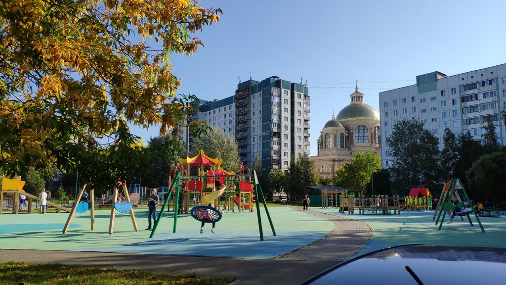 Прекрасная площадка большая, просторная ,есть горки для самых маленьких, вид на храм.