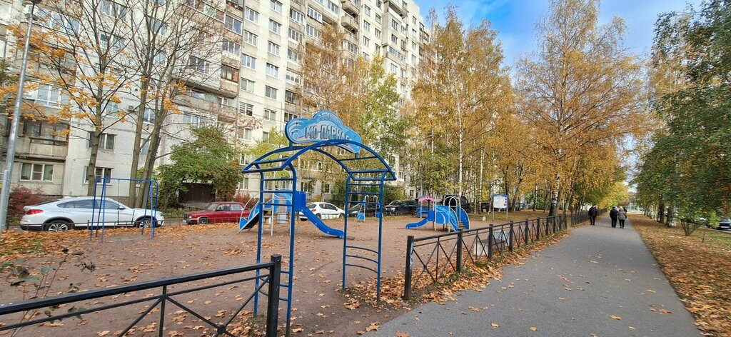 Площадка небольшая, но есть всё необходимое для веселой прогулки: несколько качелей, горок, лестница, чтобы полазить, домик-беседка, песочница. Три скамьи для отдыха. Сама площадка расположена в кармане дома, с двух сторон окружена деревьями, что делает прогулку с ребенком более комфортной при ветренной и прохладной погоде.