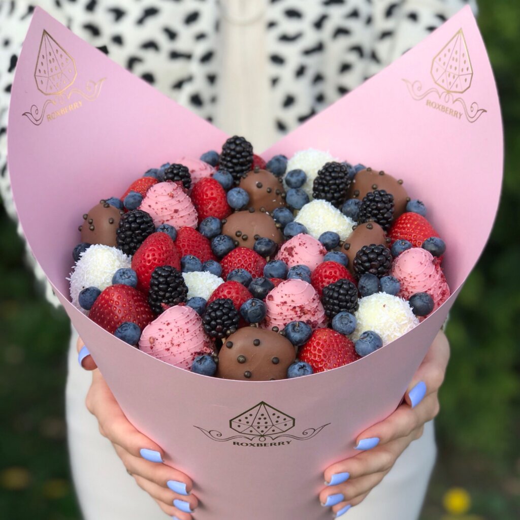 Букет из клубники, ягод и клубники в шоколаде "Комбо" размер S - розовый