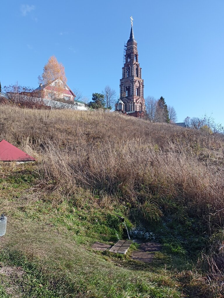 Колокольня красивая, жалко, что закрыта и родник уместен. Вода вкусная и холодная