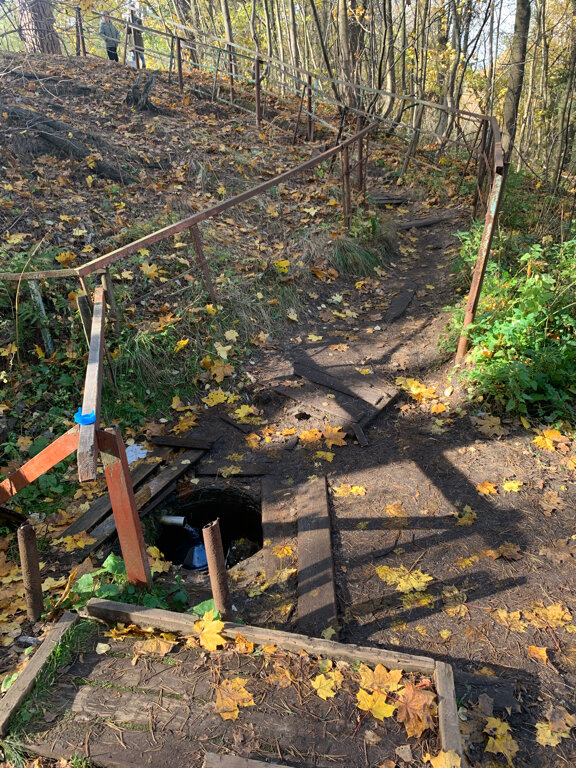 Это хорошее место здесь можно набрать воду вода чистая и вкусная нет очередей и два родника один удобный другой не очень такая же ситуация с лестницами одна удобная другая нет не совсем удобная дорожка но это заслуженные четыре звезды.