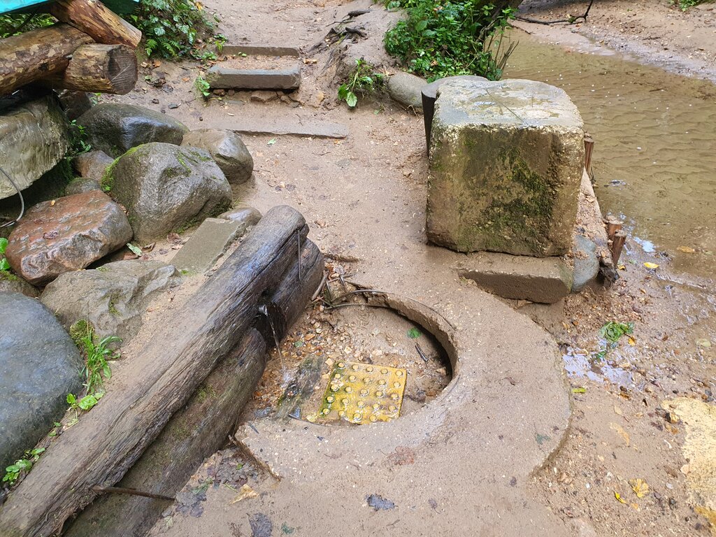 родник, один из немногих в Битцевском лесу. сделан колодец из трубы бежит вода, подход хороший через речку перекинут мостик