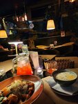Были в четверг с 18 до 20. В 18 часов мы были одни, к 19 люди стали подходить, к 20 уже была занята половина столиков. Одно из самых старых мест на районе. По возрасту наверно только с Йоркширом может соревноваться. Интерьер интересный, музыка негромкая, после 20 прибавляют, но орать еще не нужно. На первое заказали брускетты с ростбифом (лайк), стейк салат (нет, куски мяса с зеленью, без соуса салатом это не назвать), салат нисуаз (лайк), стейк шатобриан (большой лайк, особенно добавлял перечный соус, рекомендую), командорский кальмар (скучно и неинтересно, особенно на фоне стейка). Пиво шпатен (отлично), коктейли маргарита клубничная и беллини - жене понравились, говорит, что алкоголя не пожалели. Оплата картой есть, но если наличными, то основное меню -30%, барное -20%. С такими скидками стоит заранее посетить банкомат. Место рекомендую, придём еще.