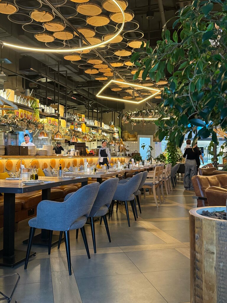 Забронировали на сайте столик - выделили место за занавеской, было уютно и близко к кухне. Официант Зафар помогал с выбором из очень разнообразного меню, сделал затравку перед едой из масла и бальзамического уксуса с приправами для принесённого им пакета свежего хлеба. Работал профессионально, быстро, достойно и качественно, мои почтения. Порции блюд большие. Брали тыквенный крем-лимонад тархун-лемонграсс, суп с креветками, сырбургер и люля из баранины, а также Пиццу с грушей. Суп - мягкий, насыщенный и сытный. Приправы подчёркивают вкус, а не выделяются на фоне. Сырбургер - оригинальная подача (разрез пополам) не давала нормально ухватиться не испачкавшись в огромном количестве сыра и сырного соуса, толстая и прекрасно прожаренная котлета отлично оттенялась мягкой булочкой, свежей зеленью и помидорами. Пицца - на тонком тесте, с достаточным количеством добавок и сыра была приятной и нежной, с отличным мягким вкусом. Блюда принесли очень быстро (в течение 5-7 минут после заказа). А для именинницы (моей супруги) сделали подарок от заведения - кусочек фирменного торта с хурмой со свечкой и поздравление. Было очень приятно. (П.С. Торт с хурмой - сезонный продукт - и просто объедение: мягкие тонкие бисквиты с нежным сливочным кремом и нереально вкусной посыпкой из белого шоколада сверху). Единственный минус - дороже среднего чека. У нас получилось по 2500 руб на человека.