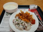 It is delicious, but the prices are high - 2 servings of hot (meat with mushrooms + mashed potatoes and beef with rice) and 1 milk drink for 4260 tenge (about 910 rubles). And this is the first time I've seen cold dishes served in the dining room, and then you got in line to warm up.