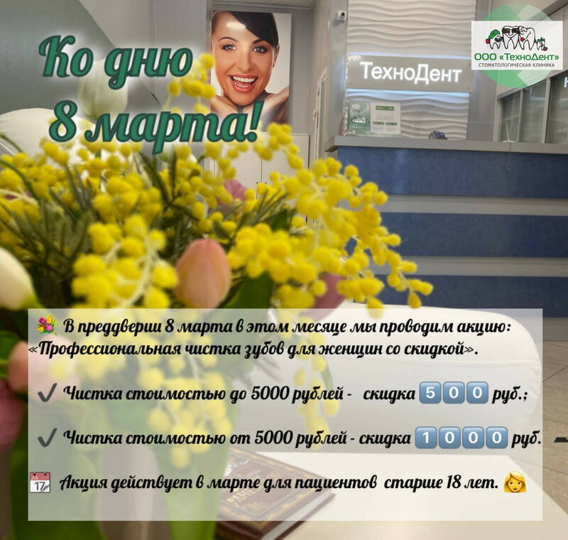 Новость в Стоматологической клинике ТехноДент К дню 8 марта *Подробнее можно узнать по телефону, указанному в профиле