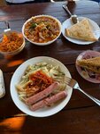 Еда дороговата даже для кафе на трассе. Первое и второе около 450 рублей. Чай салат и пирожное еще 200. Меню скудное, часть из меню нету в продаже. Еда на 4 с натягом. Мест мало, может быть такое что придётся ждать когда освободятся столики. Поэтому максимально 3 звёзды