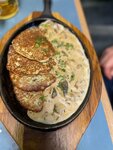 Мачанка с куриным филе и сливочным соусом с боровиками, шампиньонами и луком, подается с тонкими блинами