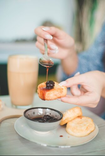 Порция сырников со сметаной и брусничным соусом