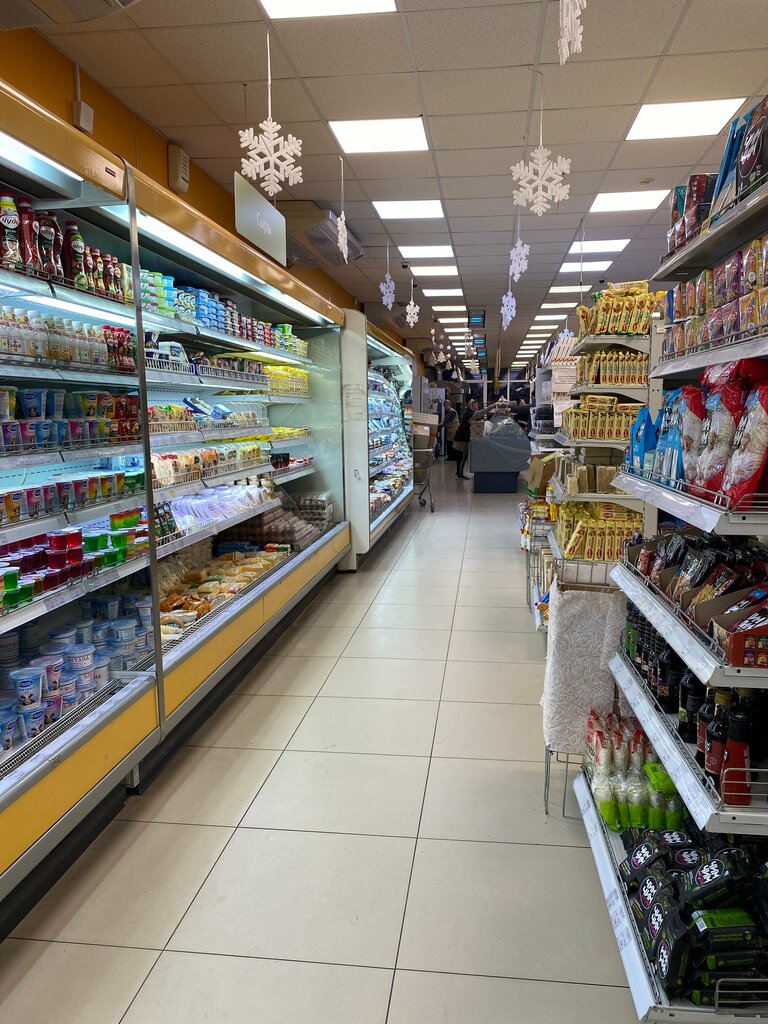 Есть практически В кулинарии богатый ассортимент готовых блюд. Вкусная пицца, булочки всегда свежие вкусные. фермерское охлаждённое мясо птицы, свинина,маринованный шашлык. Овощи-фрукты. Да много чего. Есть парковка. Из минусов, мало касс работает в час пик