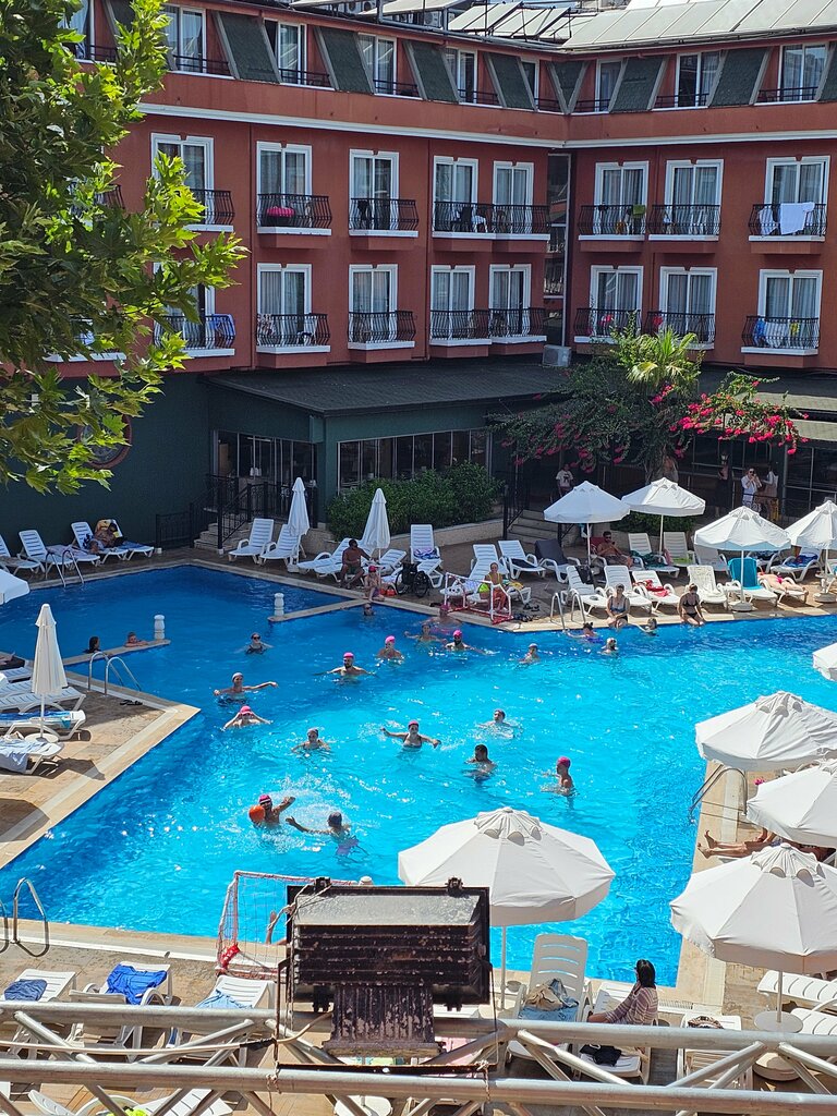 We stayed at the hotel from 30.06.25. to 6.07.25. We arrived at 9 a.m., before checking in at 14:00, we couldn't wait, my husband asked directly how much we had to pay to check in earlier, asked for $ 40, paid and we were immediately given room keys, escorted, and carried our luggage.The room was given in the main building, on the 3rd floor with a view of the mountains, which we were glad of. The room was cleaned every day, by very nice women. Free Wi-Fi is not available on site, we took a paid one, 4 lira per day or 1 dollar. As for the beach, we just saw that it's packed and very small. We went to a wild beach where there are no people and the water is clean. The hotel has three pools, not big, but there is plenty of room for everyone. Nutrition- you won't stay hungry for sure. There is a huge selection of food, a very wide variety of sweets. We went to the dining room later and there were always places. Many savages would arrange a stampede near the dining room doors and then a battle for food would begin. People try to justify their trip and put as much on their plates as they can't eat, all of it remains on the tables.The snack bar has been open since 11, there are many different snacks, everything is delicious. The alcoholic beverages included white and red wine, beer, and several types of cocktails. For entertainment, there is a disco on the roof, we went up, looked, and left, there is not enough space, the queue for alcohol occupies the floor of this roof)) The Turks do not hide their bad attitude towards us, the guide at the meeting said so, they do not like Russians here, to which I said that we are Tatars, and they answered me - well You're from Russia. There are a lot of lonely Turks vacationing at the hotel and they behave like pigs, but you have to see how drunk they get. But for single girls, it's just a tasty morsel, they just hang around them, it's sad to watch. There are a lot of boutiques near the hotel, and an exchange office is also nearby, but the exchange rate is not profitable. They don't charge less than 5 thousand for an exchange. All in all, it's not bad, but we're definitely not going back here.