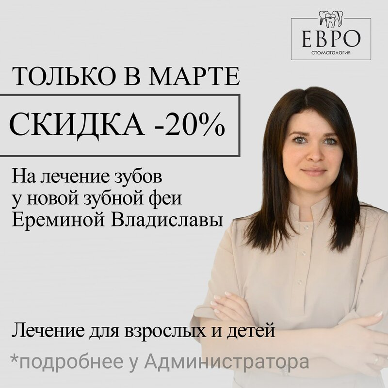 Лечение зубов со скидкой -20% в ЕвроСтоматологии в Белгороде: знакомство с новым врачом Ереминой Владиславой Олеговной Боль в зубе, чувстви...