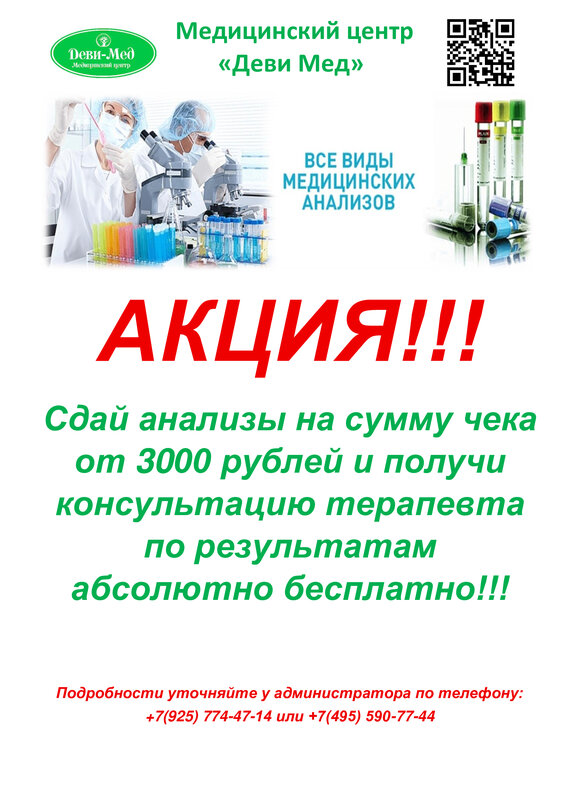 Сдай анализы на сумму чека от 3000 рублей и получи консультацию терапевта по результатам абсолютно бесплатно!!!