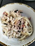 Отзыв про комплексный обед: Еда не понравилась, есть можно, но не вкусно совершенно. Суп жиденький, очень странный салат с макаронами (фото) - неприкрытое использование остатков гарнира, напитки разбавлены до состояния цветной воды. Из плюсов: довольно чисто, приятные столики, летняя зона на улице. За те же деньги в центральных столовых Питера намного лучше. Заведение не рекомендую.