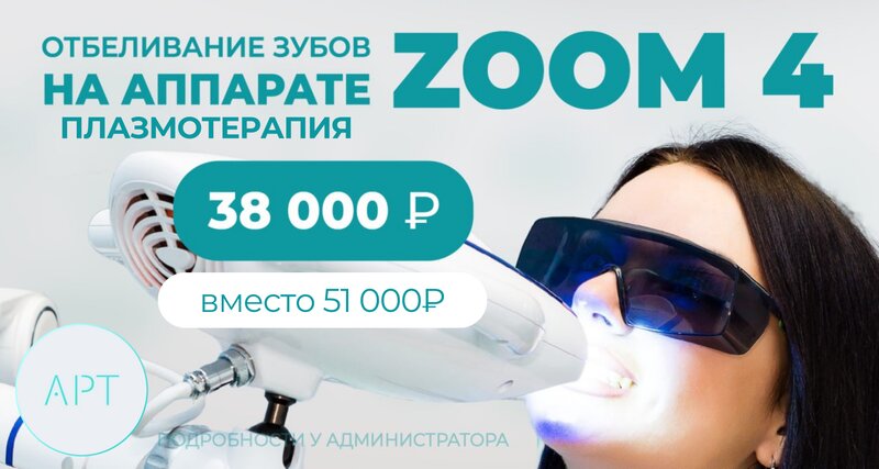 Акция Отбеливание на аппарате Zoom 4 Всего за 38 000 ₽ вместо 51 000! Отбеливание зубов в АРТ — шаг к сияющей улыбке и яркому настроению! Подробнее у Администратора